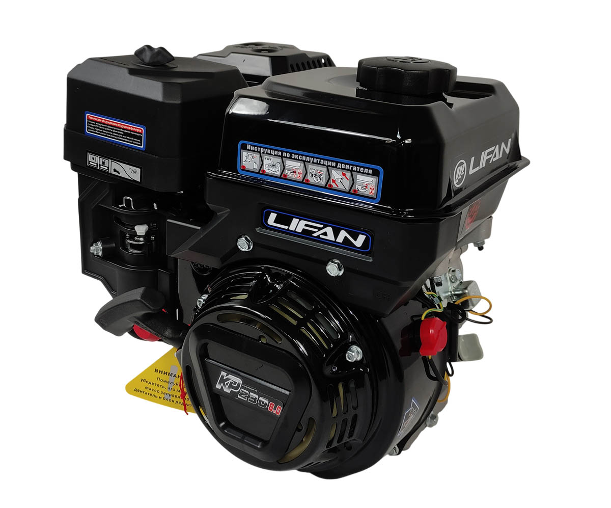 Двигатель LIFAN 8+ л.с. KP230, (вых. вал d19 мм), с катушкой освещения 12В 7А 84Вт обладает массой в 16 килограммов, это легковесный и компактный агрегат, он способен обеспечить высокую продуктивность работы при минимальных затратах и потерях. Его простая конструкция не создаст проблем при установке или при обслуживании, использование эффективного воздушного охлаждения позволяет активно использовать мотор даже в жаркую погоду.
