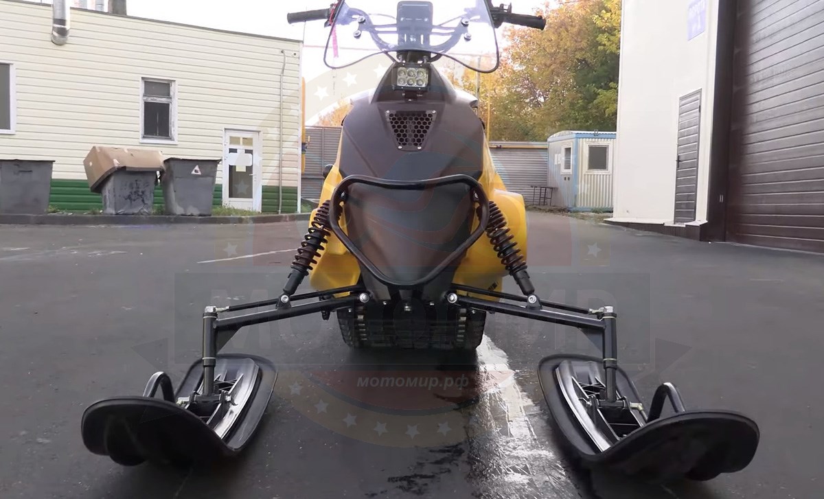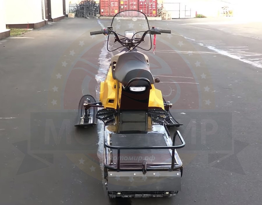Также у буксировщика широкая колея и в комплект поставки входит накладки на лыжи, которые позволяют увереннее двигаться буксировщику по более глубокому снегу. Есть панель приборов, ветровик, подогревы рукояток и курка газа, что делает поездку более комфортной. Под седлом расположен багажный отсек, есть прицепное устройство для того, чтобы можно было зацепить сани волокуши.