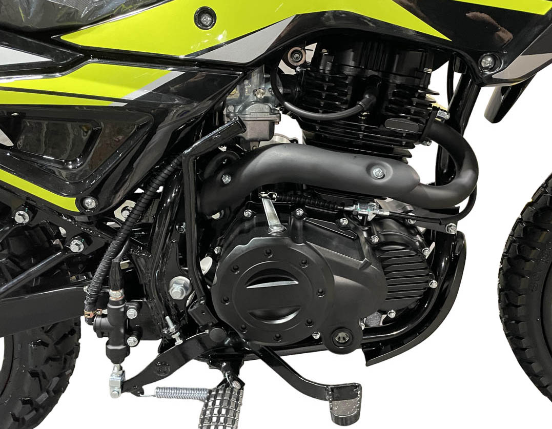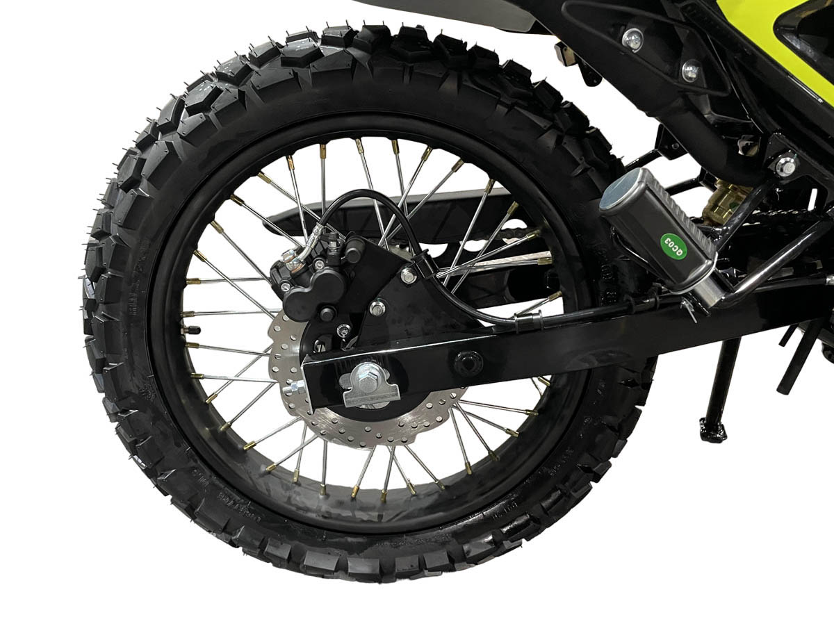 Высота посадки небольшая, примерно 800 мм, т.е. он подходит людям любого роста, на нем комфортно ехать, сесть на мотоцикл и слезть с него, удобно людям любого роста. Подножки смещены вперед, для удобства в долгих поездках, установлены пульты мотоциклетного типа и полноценная светотехника, в отличие от мотоциклов внедорожного типа, где установлены упрощенные пульты управления и усеченная панель приборов. Колеса размерностью 80/100-21, 120/80-18", с комбинированным рисунком (асфальт/грунтовка), передний и задний тормоз - дисковые гидравлические.