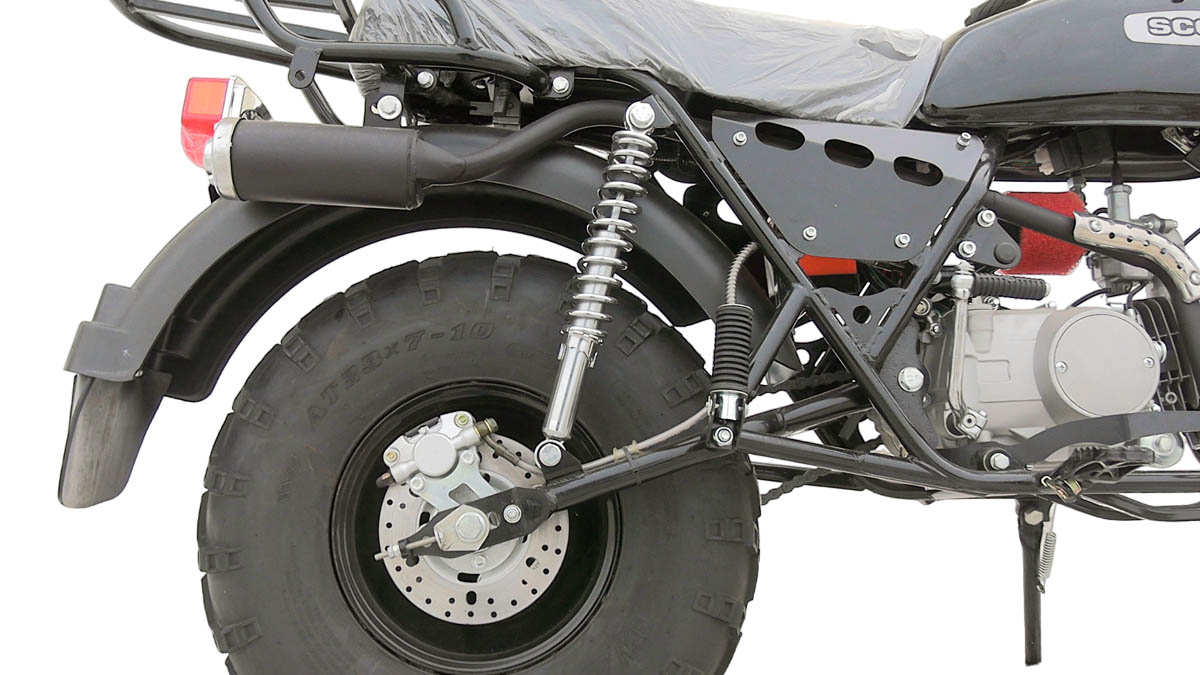 У него нет задней подвески , он является альтернативой сельскому скутеру , просто когда нужно доехать до магазина или съездить на относительно небольшое расстояние , чтобы не ходить пешком и не ехать на велосипеде . На нем так же установлено более простые узлы и детали , которые подлежат самому простейшему ремонту в полевых условиях , там стоит тот же двигатель Lifan, на которым можно легко найти запчасти повсеместно , поэтому ремонт достаточно дешев и очень прост.