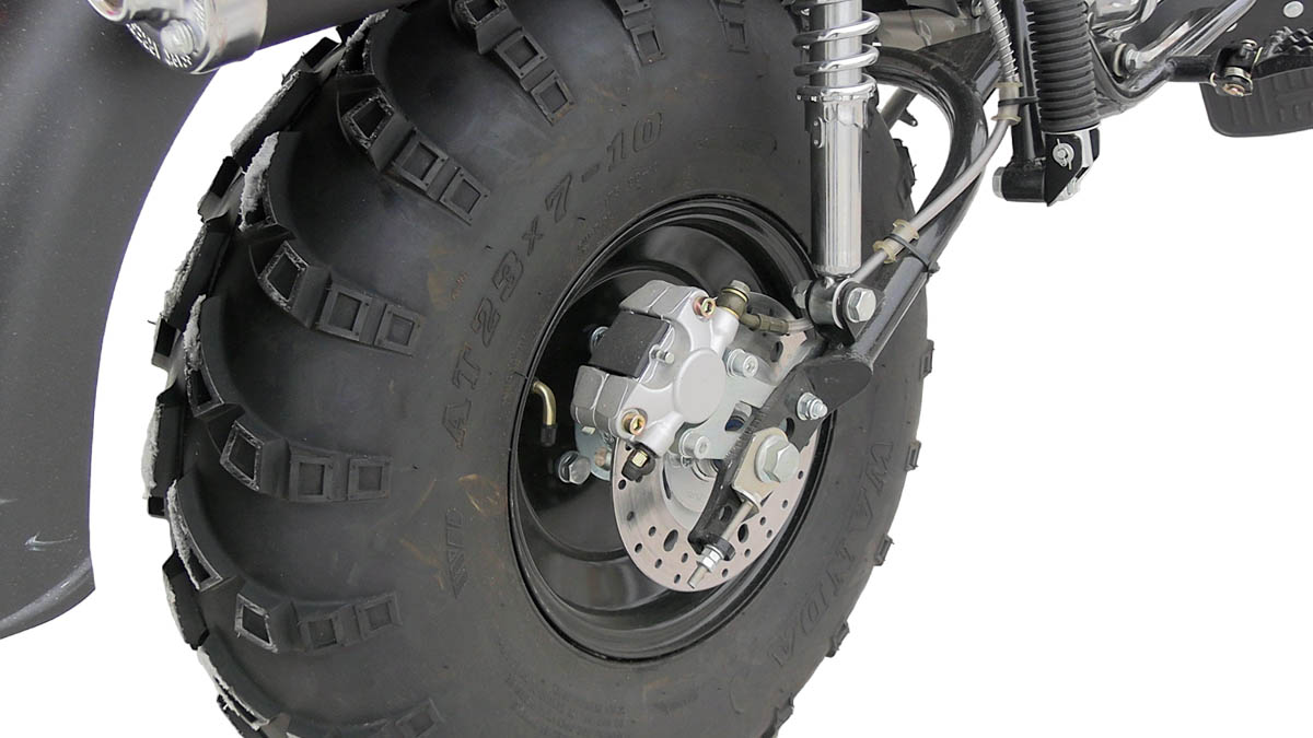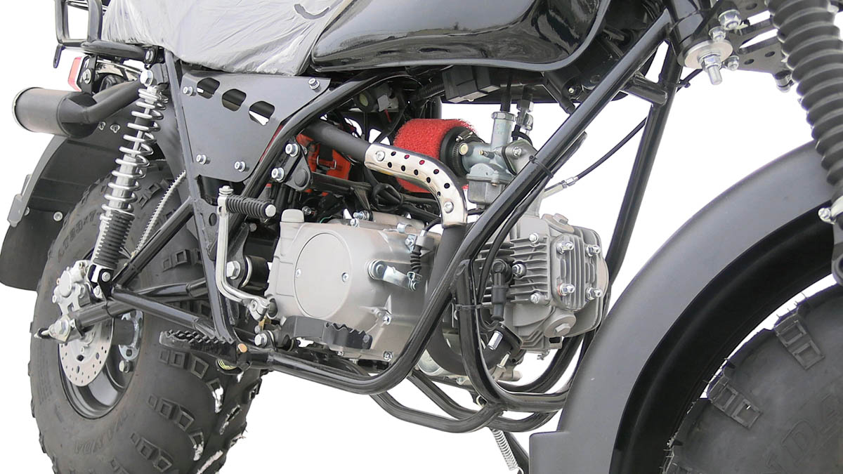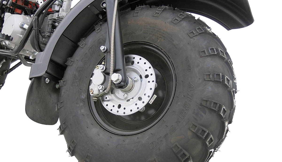 Отличительно особенностью являются широкие колеса низкого давления , размером 10 дюймов, которые используются от квадроциклов АТВ. Это дает мотоциклу большую устойчивость, т.е на нем комфортно, с точки зрения устойчивости по внедорожной местности , ухабистой местности , это дает большую проходимость в условиях с бездорожья.