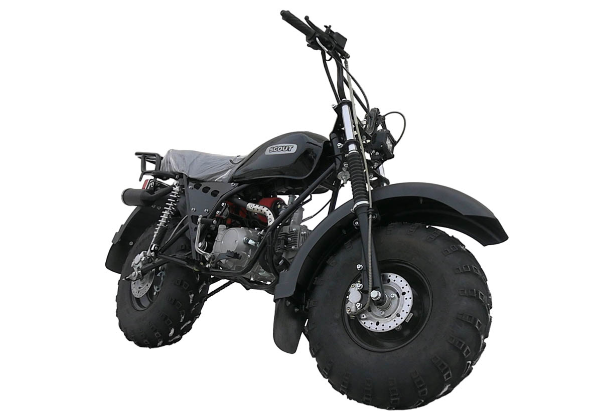 Есть простейшая и самая дешевая версия, это - Скаут-2, там применяется универсальный двигатель типа Lifan, с автоматическим сцеплением и редуктором. Эти мотоциклы предназначены для каких-то утилитарных целей - поездки за грибами, поездки на рыбалку, на охоту , в лес , просто транспортные перевозки в сельско местности. Соответственно, плюсом является то что к такому мотоциклу можно подключить боковой прицеп или задний грузовой прицеп, боковой грузовой прицеп или задний боковой прицеп и в таком случаем, мотоцикл получается грузовым .