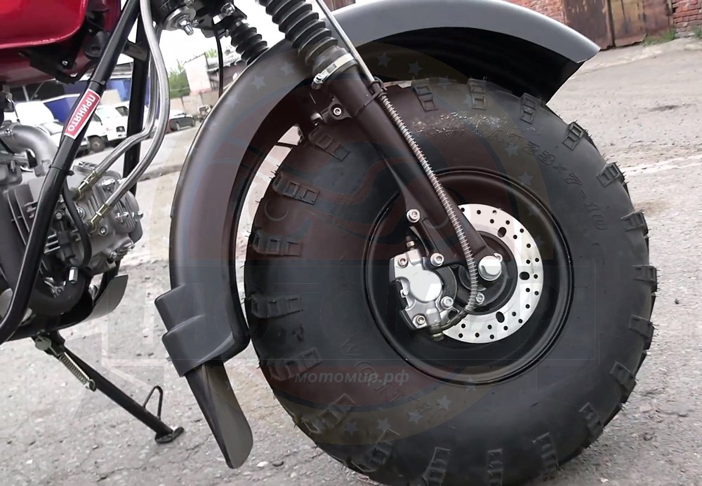 Отличительно особенностью являются широкие колеса низкого давления , размером 10 дюймов, которые используются от квадроциклов АТВ. Это дает мотоциклу большую устойчивость, т.е на нем комфортно, с точки зрения устойчивости по внедорожной местности , ухабистой местности , это дает большую проходимость в условиях с бездорожья.