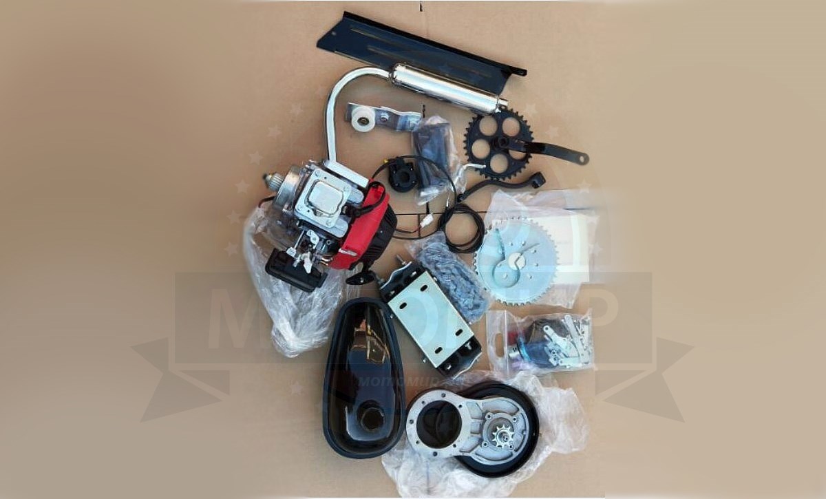 За 6 тысяч можно купить полный комплект и там будет всё необходимое: Веломотор, система питания (карбюратор), выхлоп (глушитель), бензобак, соответствующие крепления на раму, трансмиссия, задняя звезда, цепочка, все крепления для установки задней звезды на заднее колесо, все необходимые метизы.